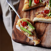 普通面粉、水、盐、橄榄油、干酵母、油浸金枪鱼罐头、马苏里拉奶酪、芦笋、小番茄、土豆、培根、黑胡椒、番茄酱。