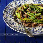 嫩牛肉、芦笋、大蒜、姜丝、黑胡椒、橄榄油、蛋清、淀粉、精盐、生抽。