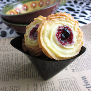 黄油、低筋面粉、鸡蛋、白砂糖、糖粉、泡打粉、香草粉、蓝莓酱。