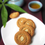 低筋面粉、黄油、核桃、细砂糖、蛋液、香草粉、杏仁片。