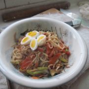面、胡萝卜、蒜苔、肉丝、香菇、鹌鹑蛋、洋葱、盐。