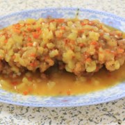 花莲鱼、菠萝、胡萝卜、果汁、糖、盐、料酒、生粉、油。