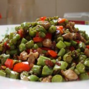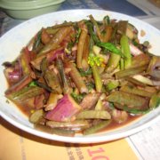 长豆角、瘦肉、红辣椒、姜末、盐、酱油、鸡精、油。