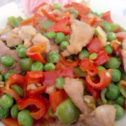 五花肉、青豆、青辣椒、红辣椒、生抽、盐、花生油、蒜头。