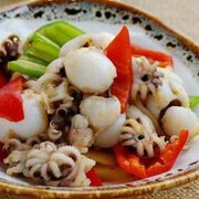墨鱼仔、青尖椒、红尖椒、姜、辣白菜。
