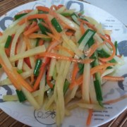 土豆、红罗卜、红椒、青椒、蒜头、食用油、盐、白醋、糖、鸡粉。