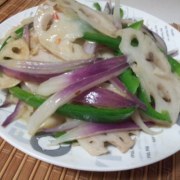 莲藕、洋葱、甜椒、小米椒、蒜头、食用油、盐、鸡粉。
