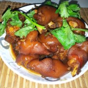 猪蹄、啤洒、生抽、老抽、料酒、草果、桂皮、香叶、冰糖、泰椒、姜片、蒜头、米醋。