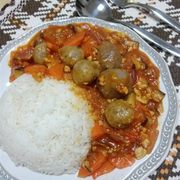 番茄、鸡胸肉、冷米饭、胡萝卜、洋葱、香菇、贡丸、油、盐、黑胡椒粉、蚝油、番茄酱。