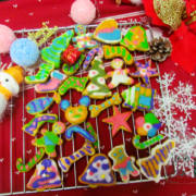低筋面粉、黄油、水、红糖粉、糖粉、蜂蜜、鸡蛋、肉桂粉、姜粉、刷表面鸡蛋、刷表面水、蛋白、糖粉、柠檬汁、各色食用色素。