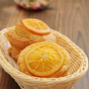 面包粉、低筋面粉、即发干酵母、细砂糖、盐、奶粉、蛋液、水、黄油、蛋黄、细砂糖、低筋面粉、橙汁、橙片。