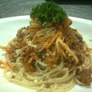 意面、牛肉碎、洋葱、胡罗卜、西芹、蘑菇、蕃西、芝士粉、番茄酱、阿里根奴。