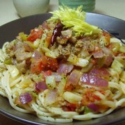 意大利粉、蕃茄、西芹、蒜瓣、干紅椒、洋葱、杂香叶、黑胡椒粉、食盐、橄榄油。