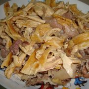猪夹心肉、腐竹、姜丝、蒜头、盐、油、生抽、生粉、麻油。