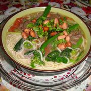 长条米粉、牛肉、姜、小葱、小芹菜、花生米、番茄、芥兰心、盐、生抽、粟米粉、麻油。