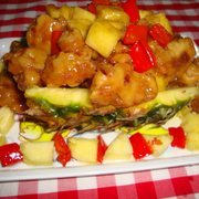 菠萝、猪肉、面粉、粘米粉、鸡蛋、红辣椒、白醋、白糖、麻油、盐、生粉、生抽、老抽、小苏打、番茄酱。