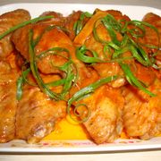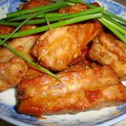 鸡中翅膀、奥尔良调料、茶油、生抽、盐、生姜、杨梅酒、生粉、葱。