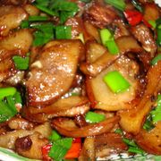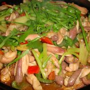 猪腰、猪粉肠、猪肝、瘦肉、红头蒜苗、生姜、菜椒、红辣椒、西兰花、南乳、生抽、盐、花生油、生粉、杨梅酒。