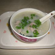 米、水、瘦肉、皮蛋、小葱、油、盐、生粉、生抽。