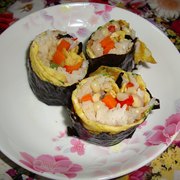 米饭、紫菜片、鸡蛋、红萝卜条、青红辣椒片、玉米、小葱、白醋、白糖、生抽、麻油、盐、生粉。
