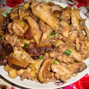 新鲜土鸡、干香菇、生姜、小葱、食用油、盐、生粉、生抽。
