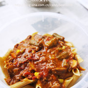 意大利面、牛肉碎、荷兰豆、玉米、豌豆、胡萝卜、蘑菇、奶酪、黄油、柠檬汁、冬阴功酱。