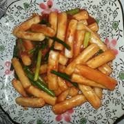 鱿鱼、胡萝卜、青椒、葱、姜、蒜、食用盐、白糖、海鲜酱油、料酒。