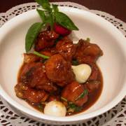 鸡腿肉、生姜、小葱、洋葱、独蒜、红辣椒、罗勒叶、米酒、生抽、小磨麻油、料酒、冰糖、花生油。