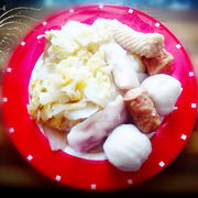 火锅年糕、圆白菜、西葫芦、西红柿、鱼丸、虾饺、鱼豆腐、盐。