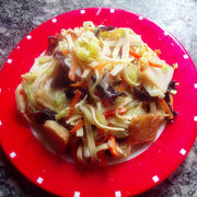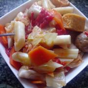 圆白菜、胡萝卜、干豆腐皮、木耳、鱼豆腐、盐。
