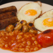 素香肠、鸡蛋、蘑菇、西红柿、豆子、盐、黑胡椒。