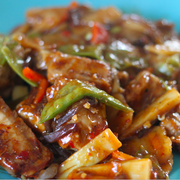 排骨、笋、扁豆、荸荠、青椒、黑木耳、洋葱、料酒、虾酱蚝油、花椒油、豆瓣酱、老抽、蒜末干料、盐、糖、花椒粉、十三香、玉米淀粉。