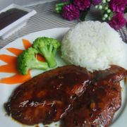 鸡胸脯、黑胡椒、盐、白糖、蒜茸、蜂蜜、食用油、生抽、老抽、料酒。