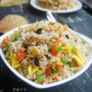 大米饭、虾仁、火腿、鸡蛋、青、红椒、盐、姜、豆豉、糊椒粉、植物油。