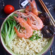 鲜虾、干面饼、小白菜、香菇、姜片、高汤、盐、香油。