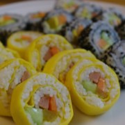 米饭、鸡蛋、火腿、青瓜、胡萝卜、腌萝卜条、芝麻、醋。