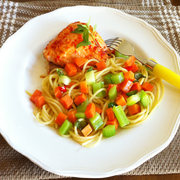 虹鳟鱼、意面、西芹、胡萝卜、小米椒、橄榄油、盐、李锦记蒜蓉辣酱、新鲜罗勒、生抽。