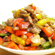 洋葱、尖椒、黄椒、红椒、猪肉、黑胡椒粉、鸡精、姜、酱油、盐、淀粉。