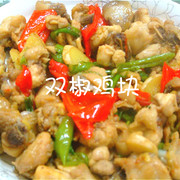 鸡腿、青椒、红椒、盐、糖、生姜、料酒、生抽。