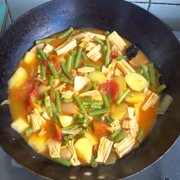 西红柿、小土豆、腐竹、豆角、葱、大料、红干椒、姜、鸡精、香油、盐。
