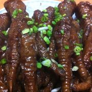 鸡爪、姜、花椒、八角、五香粉、料酒、生抽、辣椒、香叶、清水、糖、盐、蒜。