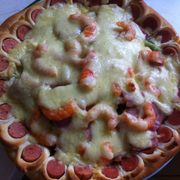 高筋面粉、温水、酵母、黄油、糖、盐、洋葱、青椒、红椒、鱿鱼、虾、马苏里拉奶酪、香肠、培根、牛至叶、罗勒、洋葱、番茄、盐。