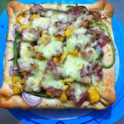 高筋面粉、酵母、温水、黄油、糖、盐、洋葱、青椒、腊肠、香肠、芒果、茄子、自制蕃茄酱、马苏里奶酪。