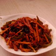 肉丝、青椒、干红椒、冬笋、木耳、鸡蛋、海鲜酱、酱油、鸡精、糖、盐。