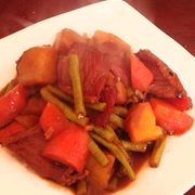 牛肉、土豆、胡萝卜、豆角、葱、姜、蚝油、海鲜酱、酱油、糖、鸡精。