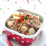 酸毛葱、牛肉、红辣椒、生抽、盐、料酒、鸡精、淀粉。