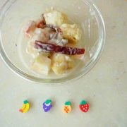 香蕉、水蜜桃、葡萄干、山楂片、色拉酱。