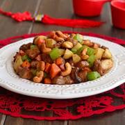西冷牛扒、马蹄、芹菜、腰果、胡萝卜、生抽、料酒、黑胡椒汁、盐、芝麻油、淀粉。