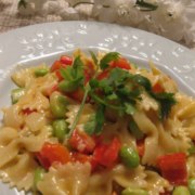领结pasta、彩椒、洋葱、西芹、西红柿、大蒜、毛豆、盐、糖、橄榄油、黄油、芝士片。
