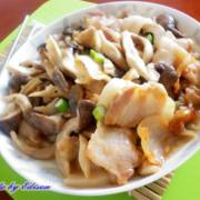 平菇、五花肉、花生油、生抽、料酒、盐、白胡椒粉、葱姜、淀粉。